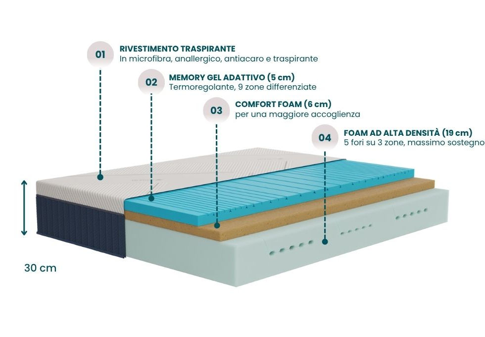Il materasso termoregolante Memory Gel Ice Veradea è ideale per chi desidera un supporto rigido su 9 zone, unito ad una superficie accogliente. Il comfort foam offre un sostegno progressivo, mentre la lastra portante in foam ad alta densità, con fori in 3 zone, assicura un sostegno altamente personalizzato e confortevole. Grazie alla sua particolare lavorazione a zone, il memory gel sulla superficie dona un effetto massaggiante e adattivo. L’innovativo tessuto termoregolante di cui è rivestito, grazie al filato effetto “ice” offre una piacevole temperatura, che resta sempre costante per un relax davvero unico. 100% Made in Italy, è un Dispositivo Medico di Classe 1 ed è certificato OEKO TEX 100. Rigidità 8/10