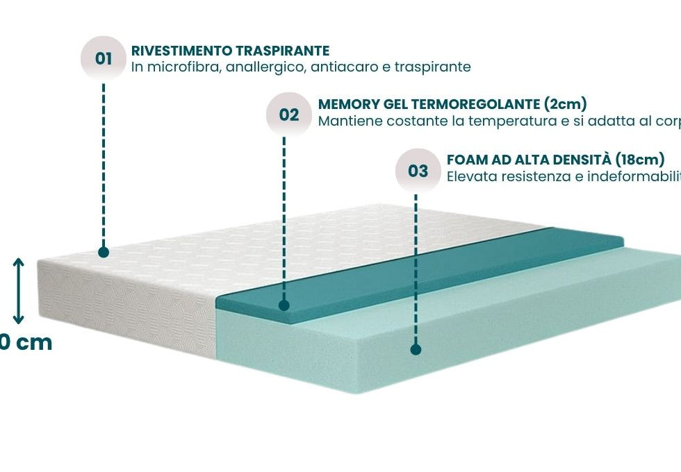 Il materasso Giusto Veradea sostiene il corpo in maniera ottimale ed è la soluzione con il migliore rapporto qualità prezzo. Entrambi gli strati di cui si compone, una lastra in foam ad alta densità ed una di confortevole memory gel, sono altamente traspiranti, indeformabili e antiaffossamento, resistenti ad ogni genere di pressione. Garantisce un riposo sereno e rigenerante, donando una costante sensazione di freschezza. 100% Made in Italy, è un Dispositivo Medico di Classe 1 ed è certificato OEKO TEX 100. Rigidità 8/10